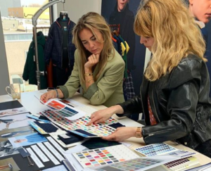 Monique kiest kleuren en stoffen uit voor haar collectie.