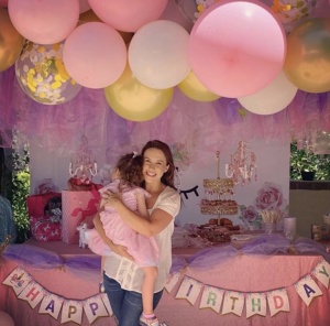 Lacey Chabert met dochtertje Julia. Hoewel haar leven niet meer uit plastic-taferelen bestaat, heeft ze ‘pink’ nog niet uit haar leven gebannen